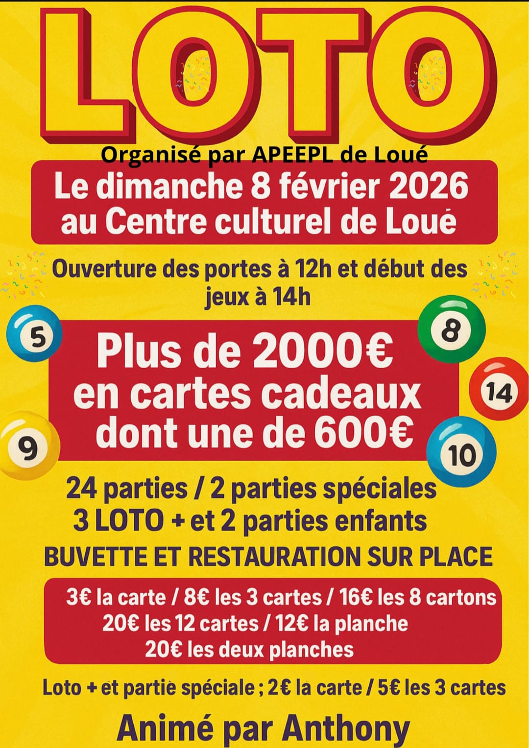 LOTO DIMANCHE 8 FEVRIER 2026 ORGANISE PAR L’APEEPL (ASSOCIATION DES PARENTS D’ELEVES DES ECOLES PUBLIQUES DE LOUÉ) DE LOUÉ.