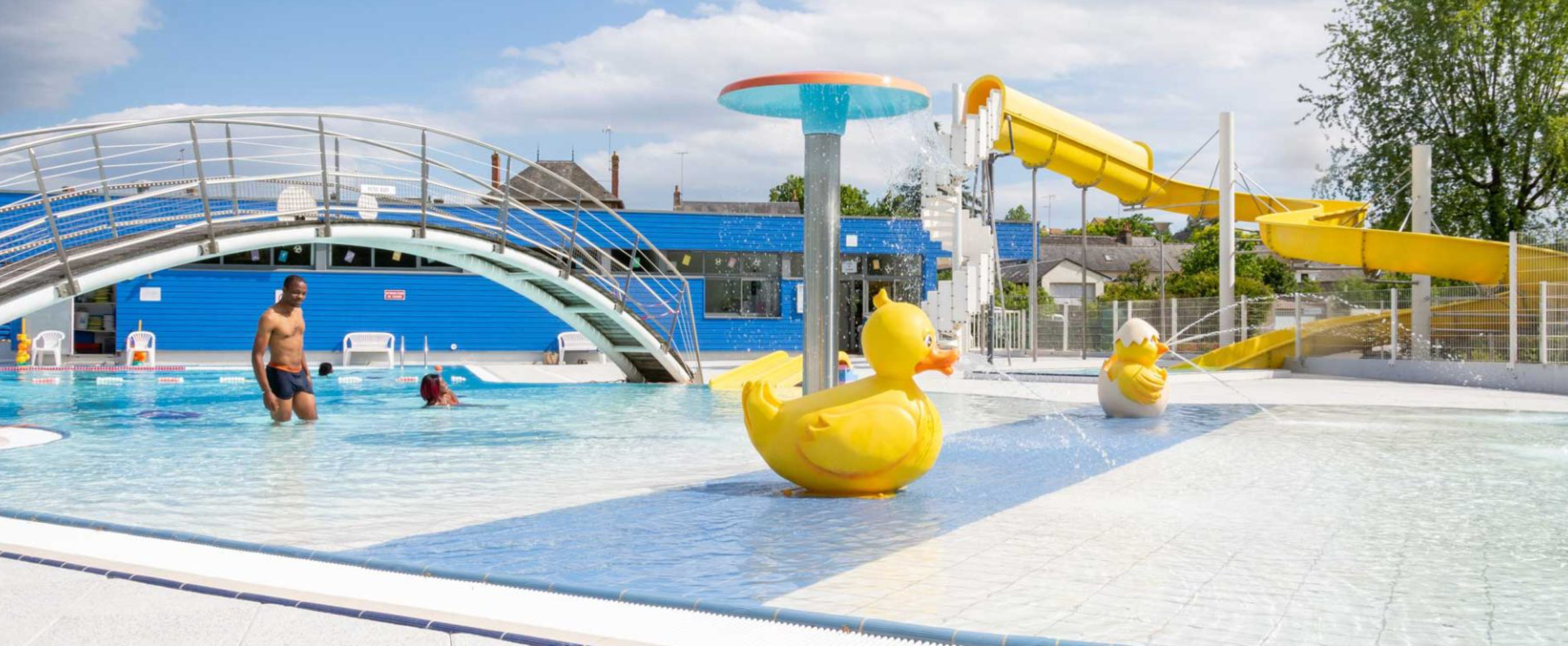 Les trois bassins communiquent entre eux. Les plus jeunes apprécieront la pataugeoire, les jeux d’eau, et le toboggan de 35 mètres. Des transats sont à disposition, et une pergola permet de s’abriter du soleil. Pour les sportifs, une zone de pelouse est dédiée à un parcours de fitness en accès libre. Boissons non alcoolisées et nourriture y sont tolérées.