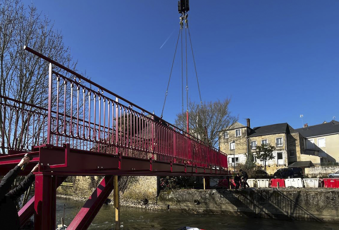 Installée au printemps 2026, la passerelle enjambe la Vègre et relie les deux parkings les plus proches du centre ville.